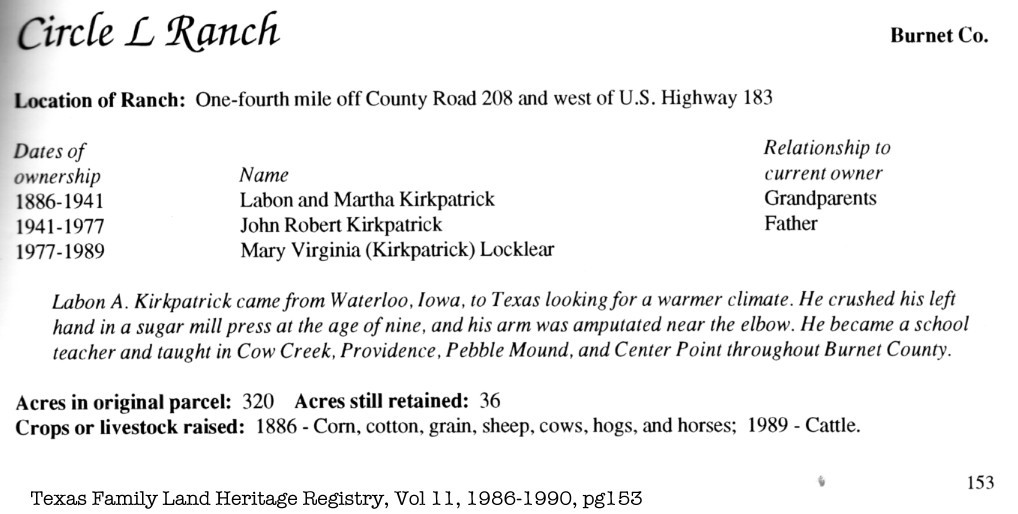 Source: Texas Family Land Heritage Registry, Vol 11, 1986-1990, page 153