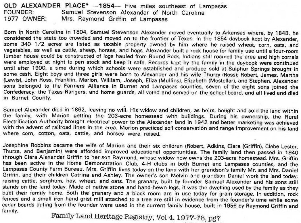 Source: Texas Family Land Heritage Registry, Vol 4, 1977-78, pg 7 and pg 70