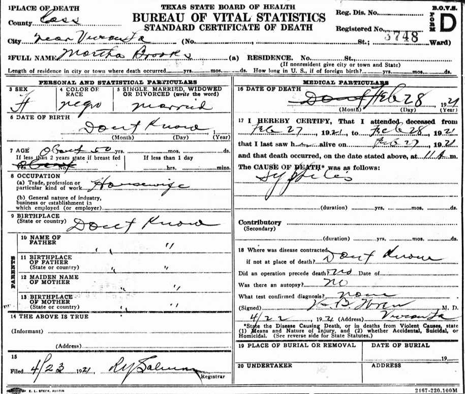 W/o Jack Brooks; D/o Joseph & Nora Lamkins; Death Certificate |