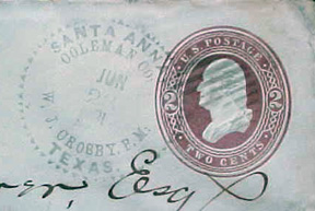 Closeup of envelope with 1881 Santa Anna, Texas postmark W. J. Crosby was the Postmaster at this time.