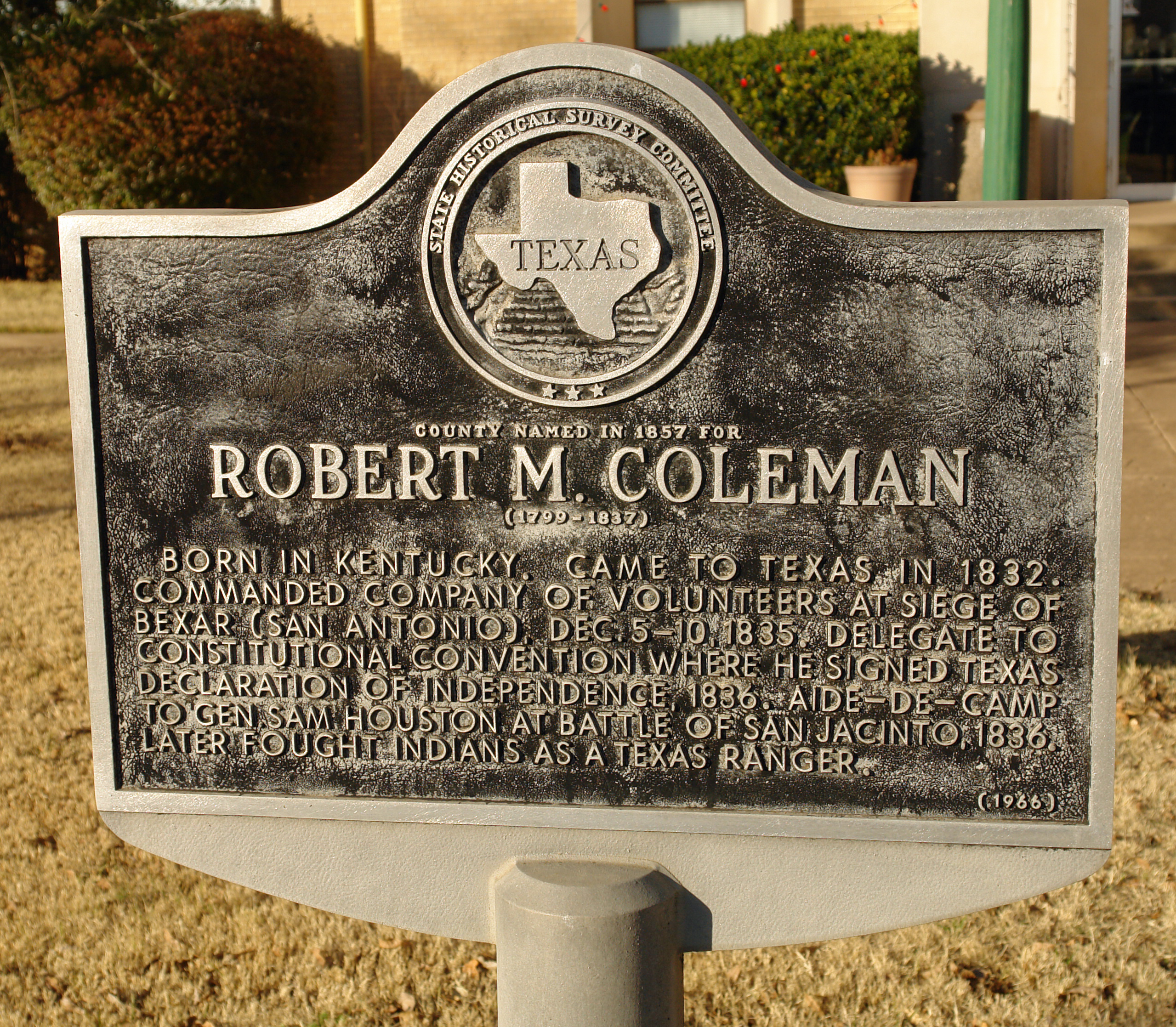 Robert M. Coleman and his family came to Texas in 1831 with their slaves with a wagon train and settled in what is now Bastrop County. One son was born there on the 5th of December 1831, and died two days later. Mr. Coleman was tall, angular and lanky; he was dark-eyed, mustached and weatherbeaten. In temperament, he was quiet but high strung and impetuous. He had the courage to attack the difficult tasks which the frontier imposed but he lacked the self control and diplomacy necessary to win the political emoluments which he might have received. He became an alcalde (mayor) in the Province of Bastrop. At the outbreak of the Texas Revolution, Mr. Coleman received a captaincy in the Texas Army, commanding the Mina Volunteers, and was soon engaged in its first great project, namely the capture of San Antonio, then held by the Mexican army. He appears to have been present at the Battle of Gonzales, the "Lexington of Texas." Captain Coleman and his company took part in the Battle of Concepcion, just below San Antonio, where the Mexicans were defeated and the way opened for the capture of San Antonio. While serving as captain of the Rangers, Mr. Coleman was elected to be a member of the General Convention which was called to meet at Washington-on-the-Brazos on March 1, 1836, and he resigned his Ranger captaincy to attend this convention. As a member of that convention he took part in drafting the Declaration of Independence and the first Constitution of Texas, and was a signatory of both instruments. That task finished, he responded to the call for all able bodied men to join General Sam Houston, then in retreat before General Santa Anna. Houston received him cordially and appointed him "Colonel, Aide-de-Camp" effective April 1st, 1836, and in this capacity he served gallantly through the battle of San Jacinto on Houston's staff, with his service terminating July 15th, 1836, according to his Republic of Texas pay records. General Houston and Col. Coleman were men of widely different traits of character and it was almost inevitable that they should disagree. There was considerable criticism of the General's military strategy and it appears that Col. Coleman permitted himself to become the spokesman for that group. Col. Coleman returned to his Bastrop county farm, but from that time on he and his family seemed to be pursued by an evil genius as cruel as it was implacable . In the summer of 1837, Col. Coleman visited Velasco with his family, was placed under house arrest by Houston, and was drowned while swimming in the mouth of the Brazos River about the 2nd of June. His widow Elizabeth, and six children returned to Webberville and attempted to carry on with their farming on Webber's Prairie after his death. On February 18, 1839, a band of marauding Indians surrounded the homestead, killed Elizabeth Coleman and the oldest son, a fourteen year old boy named Albert, and burned the house. This boy, who possessed his father's spirit, defended the family nobly until killed. Another son (James) escaped as the Indians approached, and the baby boy (Thomas) was carried off into captivity in the Indian Nation, never to return to the family. The three daughters, Rebecca, Sarah Elizabeth, and Sarah Ann, hidden under the cabin's thick plank flooring by Albert, survived the attack and were cared for by Samuel Wolfenbarger (who had served as a Ranger under Col. Coleman) until they became of age. Rebecca married Robert J. Russell, Sarah Elizabeth (who was wounded in the breast by an arrow during the attack) married William Brown, and Sarah Ann married William J. McClellan. James ranched in the area of Hornesby's Bend until his death about 1855. All the Coleman children were dead by 1860. On February 1st, 1858, the legislature created the present Coleman County and John Henry Brown (son of Henry S. Brown) the Texas historian, then a member of the legislature, suggested that the new county be named "Coleman" in grateful acknowledgement of the patriotic services of Robert M. Coleman. drawing by Judia Gaines Terry Page 18 in A History of Coleman County and Its People ![]() Coleman County named in 1857 for Robert M. Coleman (1799-1837) "Born in Kentucky - Came to Texas in