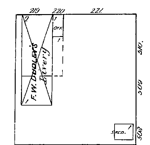 In 1888, F. W. Dudley’s Livery Stable was located in the half block bounded by East Pecan Street, South Colorado Street, East College Avenue and the alley to the west.  The north part of the livery stable was two stories tall, with the south side of the barn and the office on the east side being one story.  There was a shed on the southeast corner of the lot.