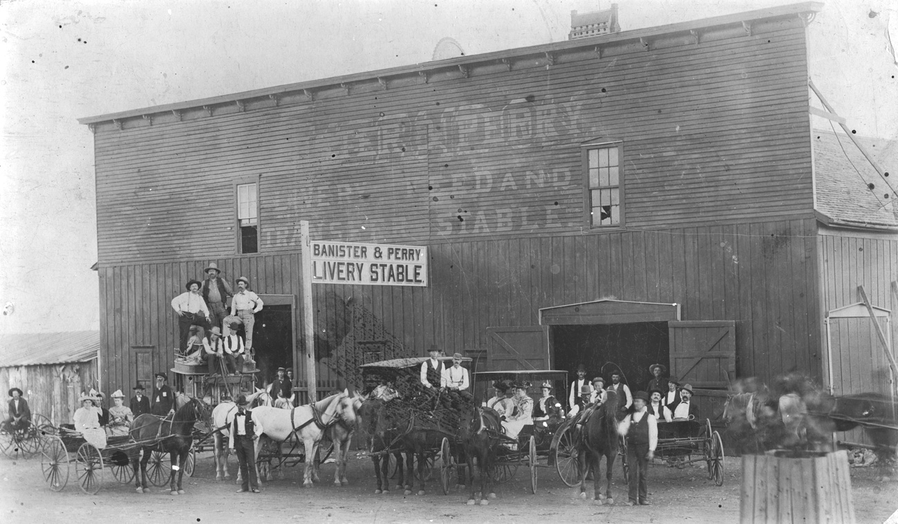 John R. Banister standing in front of the white horses, pulling the stagecoach, to the left.  The other owner, W. C. Perry, has not been identified.