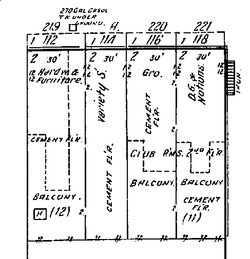 Note on this 1909 map, what would become 108 East Pecan Street is shown as 219, 110 East Pecan is shown as A, 112 East Pecan is shown as 220, and 114 East Pecan is shown as 221.  The 2 eastmost businesses were located on lot 11 and the 2 westmost were located on lot 12.