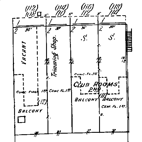 Between 1911 and 1916, the second story was added by Dr. Manes to the four brick buildings of what is now 108, 110, 112 and 114 East Pecan Street.  There were inside doors, on the second floor, connecting 108 and 110, and 112 and 114, but no indication that 110 and 112 were connected.  In addition to the second floor, there were balconies in three of the four businesses, creating a partial floor between the first and second floors.  Club Rooms were located on the second floor of the two eastmost businesses.