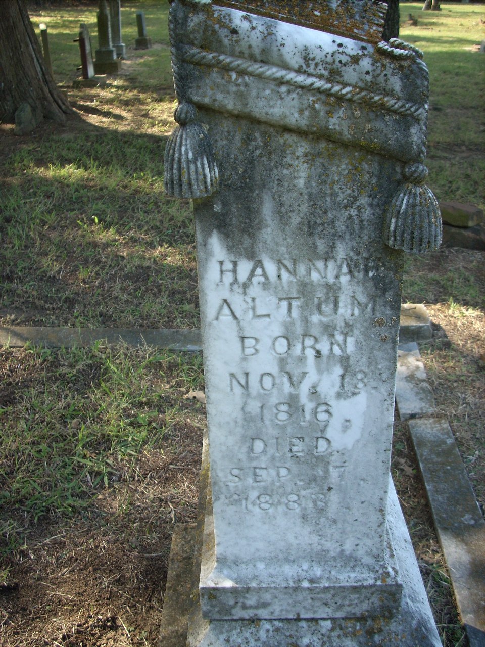 | Altum | Hannah | 11/18/1816 | 9/7/1883 | The soul has now taken its flight to mansions of glory above | 10 | |