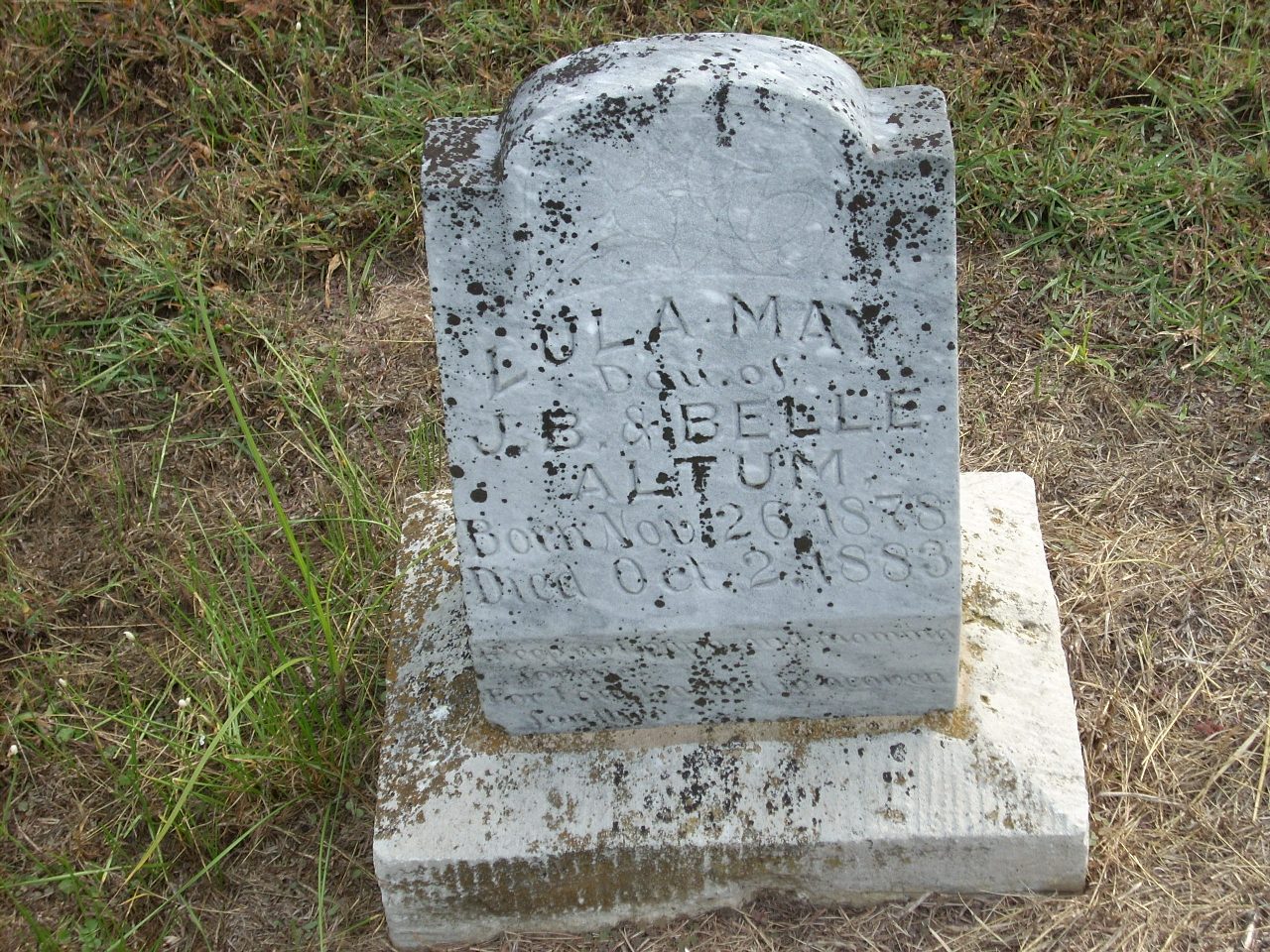 | Altum | Lula May | 11/26/1878 | 10/2/1883 | Weep not papa and mamma for me. For I am waiting in heaven for thee | 18 | |