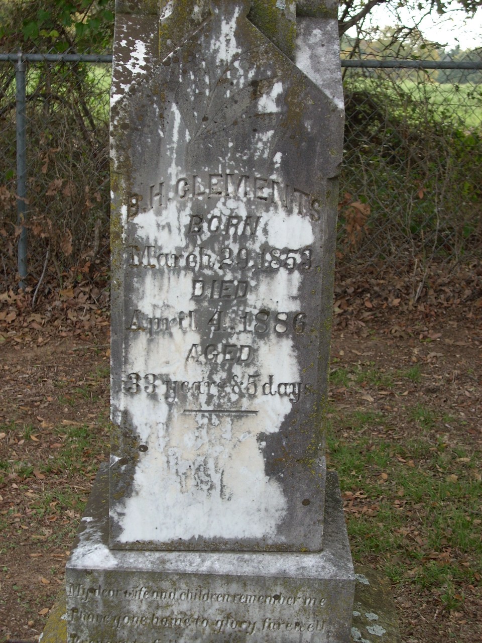 | Clements | B.H. | 3/29/1853 | 4/4/1886 | Photo | Aged 33 years & 5 days. My dear wife and children remember me. I have gone home to glory farewell. Prepare to follow me farewell | |