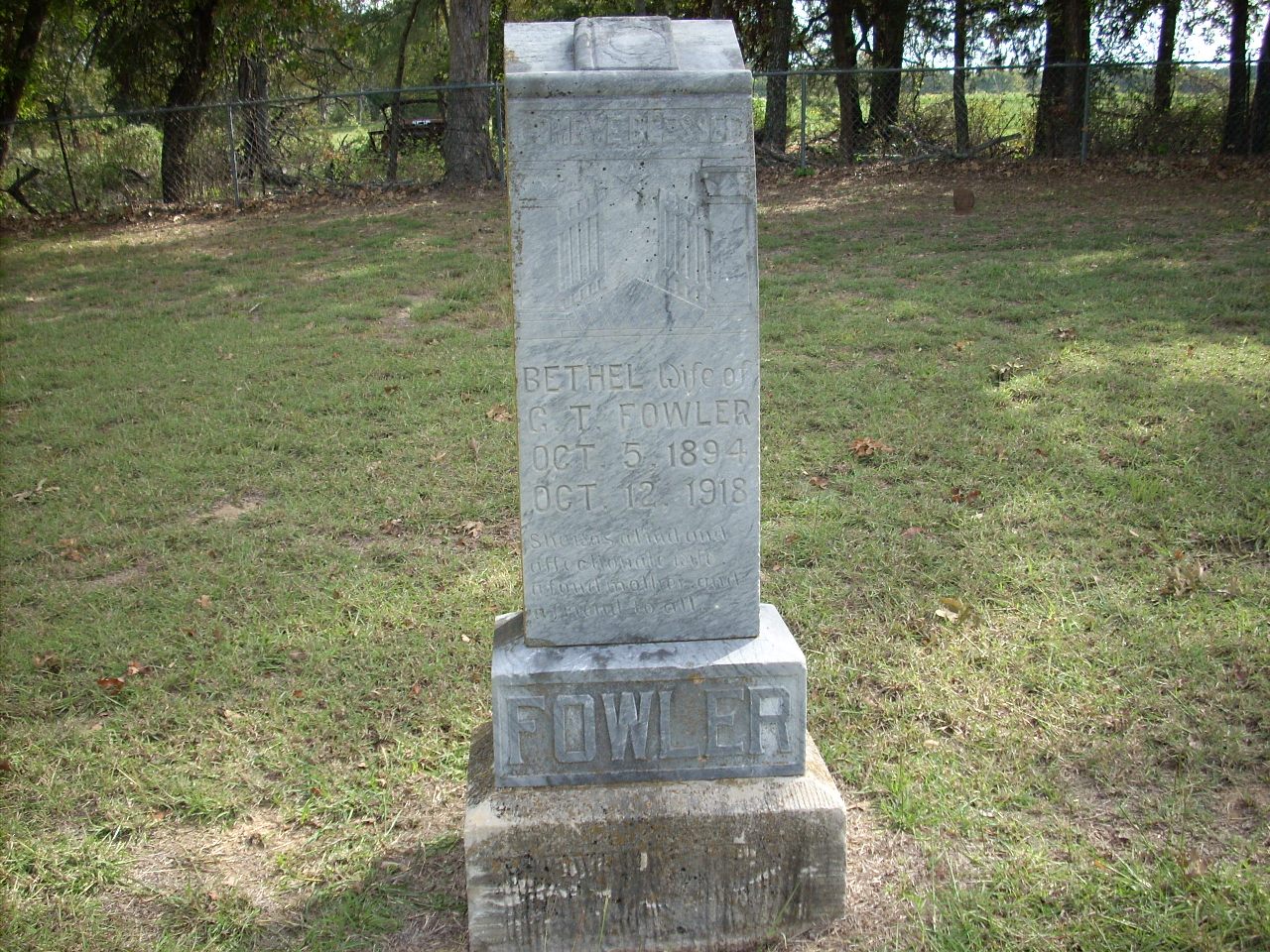 | Fowler | Bethel | 10/5/1894 | 10/12/1918 | Photo | Come ye Blessed. She was a kind and affectionate wife. A fond mother and a friend to all | 29 |