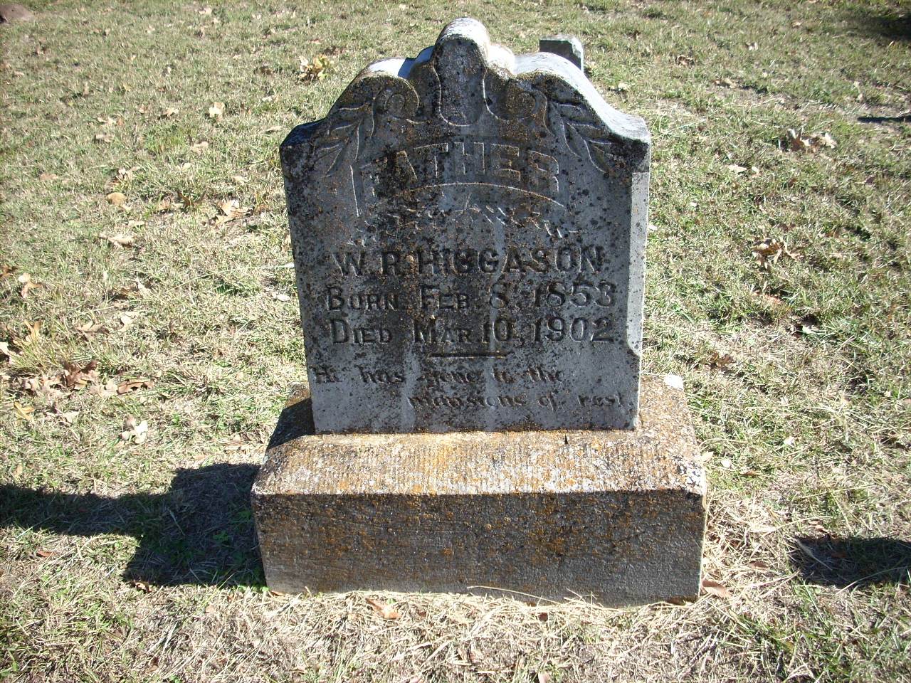 | Higgason | W.R. | 2/8/1853 | 3/10/1902 | Photo | He has gone to the mansion of rest | |