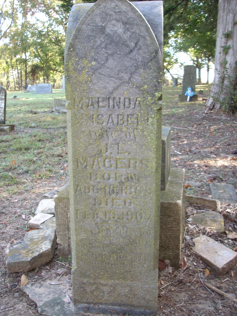 | Magers | Malinda Isabell | 8/10/1863 | 2/19/1907 | Photo | As a wife devoted. As a mother afffectionate. As a friend ever kind and true | 50 |