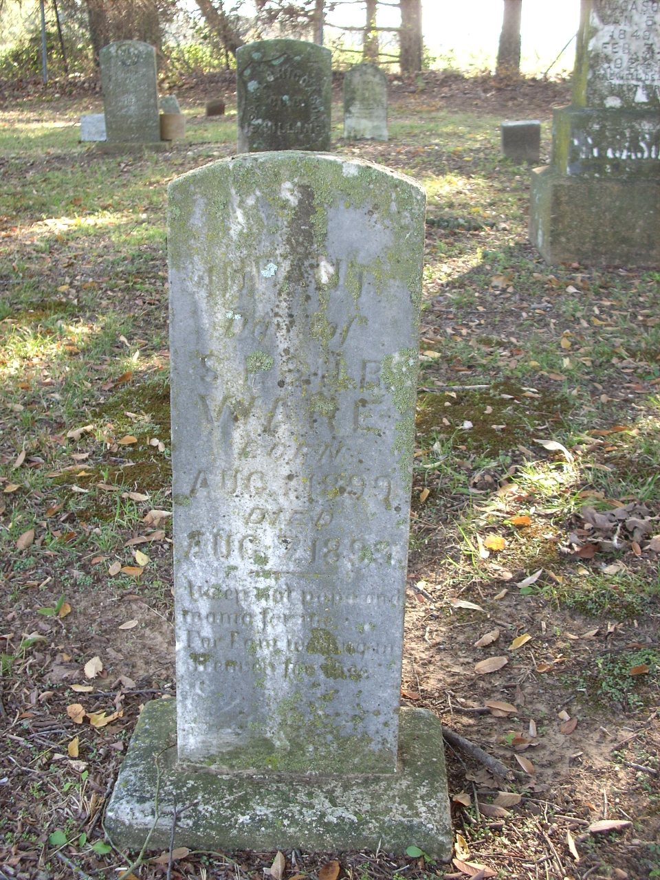 | Ware | Infant | 8/1/1899 | 8/7/1899 | Photo | Weep not papa and mama for me for I am waiting in heaven for thee | 35 |