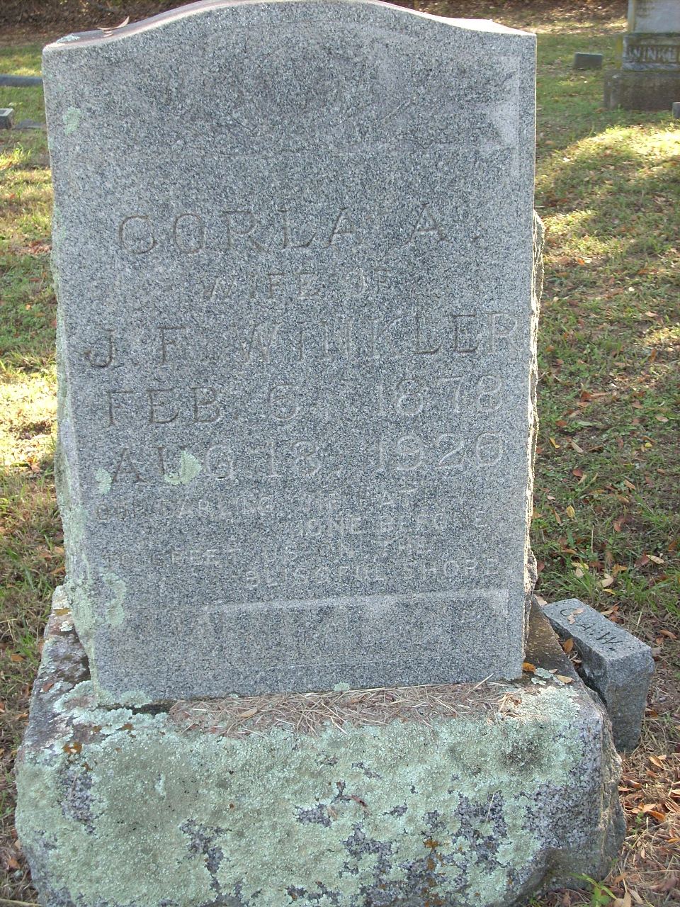 | Winkler | Corla A. | 2/6/1878 | 8/18/1926 | Photo | Our darling one hath gone before to greet us on the blissful shore | 40 |