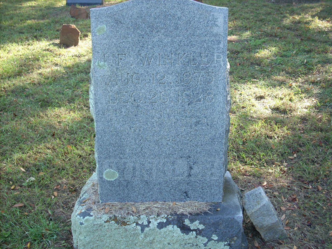 | Winkler | J.F. | 8/12/1875 | 12/26/1928 | Photo | Our darling one hath gone before to greet us on the blissful shore | |