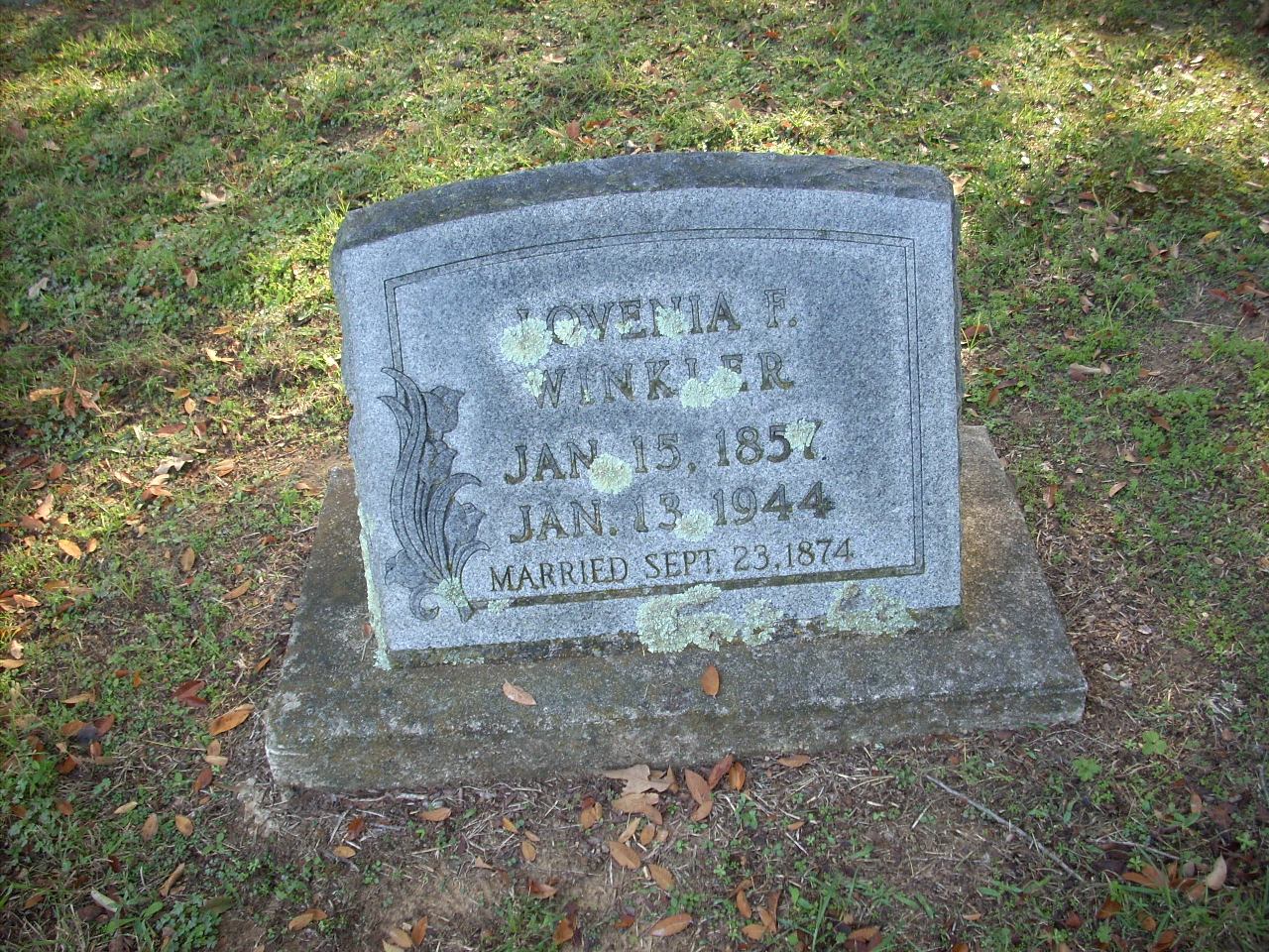 | Winkler | Lovenia F. | 1/15/1857 | 1/13/1944 | Photo | Married Sept 23,1874 | |
