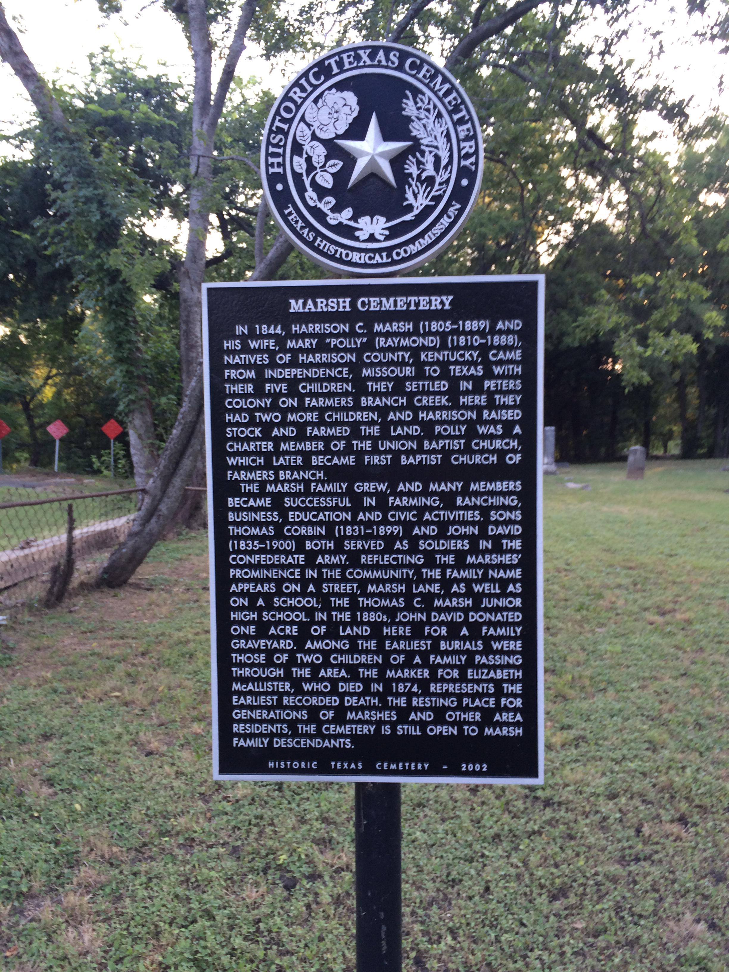 The Marsh family grew, and many members became successful in farming, ranching, business, education and civic activities. Sons Thomas Corbin (1831-1899) and John David (1835-1900) both served as soldiers in the Confederate Army. Reflecting the Marshes' prominence in the community, the family name appears on a street, Marsh Lane, as well as on a school, the Thomas C. Marsh Junior High School. In the 1880s, John David donated one acre of land here for a family graveyard. Among the earliest burials were those of two children of a family passing through the area. The marker for Elizabeth McAllister, who died in 1874, represents the earliest recorded death. The resting place for generations of Marshes and other area residents, the cemetery is still open to Marsh family descendants.