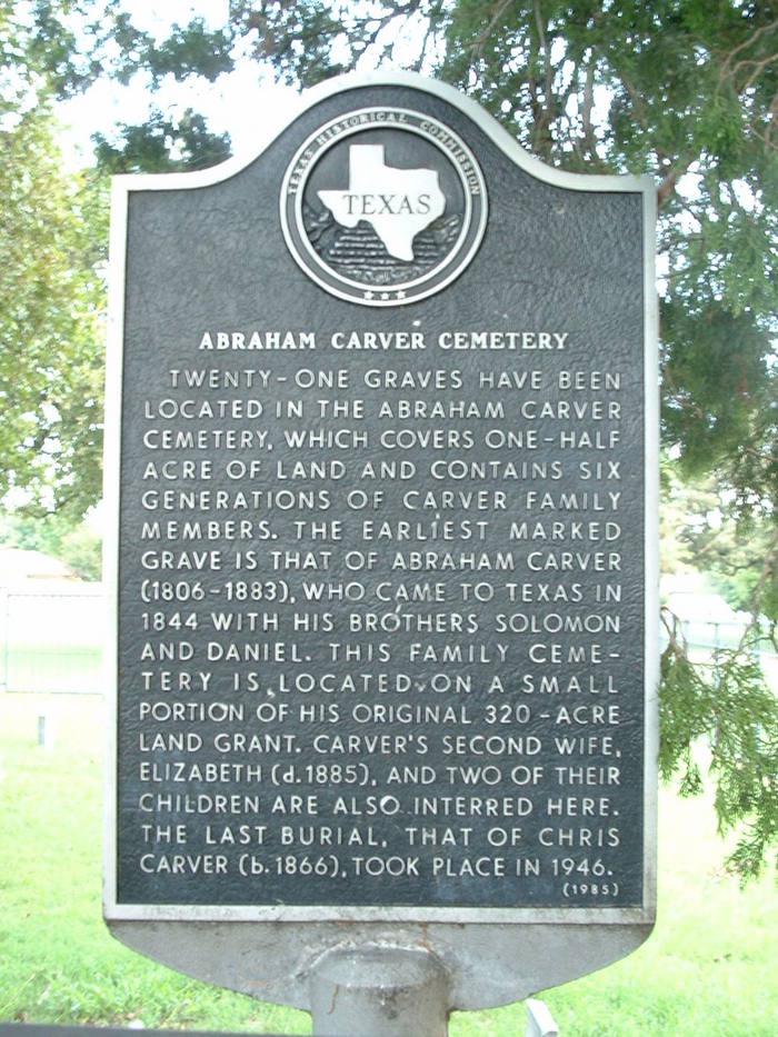 Twenty-one graves have been located in the Abraham Carver Cemetery which covers one-half acre of land and contains six generations of Carver family members. The earliest marked grave is that of Abraham Carver (1806-1883), who came to Texas in 1844 with his brothers Solomon and Daniel. This family cemetery is located on a small portion of his original 320-acre land grant. Carver's second wife, Elizabeth (d. 1885), and two of their children are also interred here. The last burial, that of Chris Carver (b. 1866), took place in 1946.