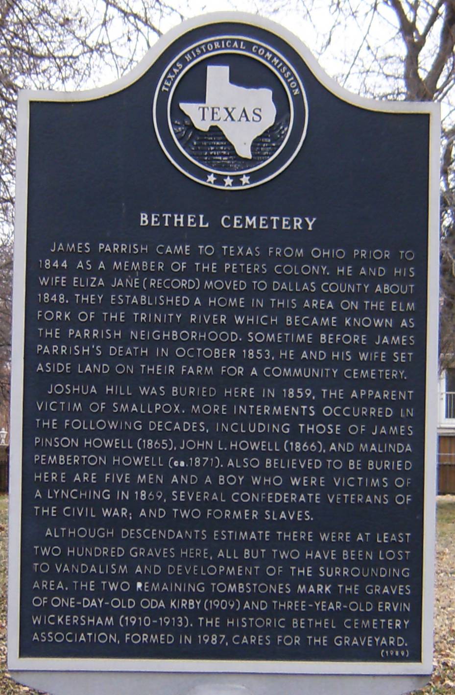 James Parrish came to Texas from Ohio prior to 1844 as a member of the Peters Colony. He and his wife Eliza Jane (Record) moved to Dallas County about 1848. They established a home in this area on the Elm Fork of the Trinity River which became known as the Parrish neighborhood. Sometime before James Parrish's death in October 1853, he and his wife set aside land on their farm for a community cemetery.
