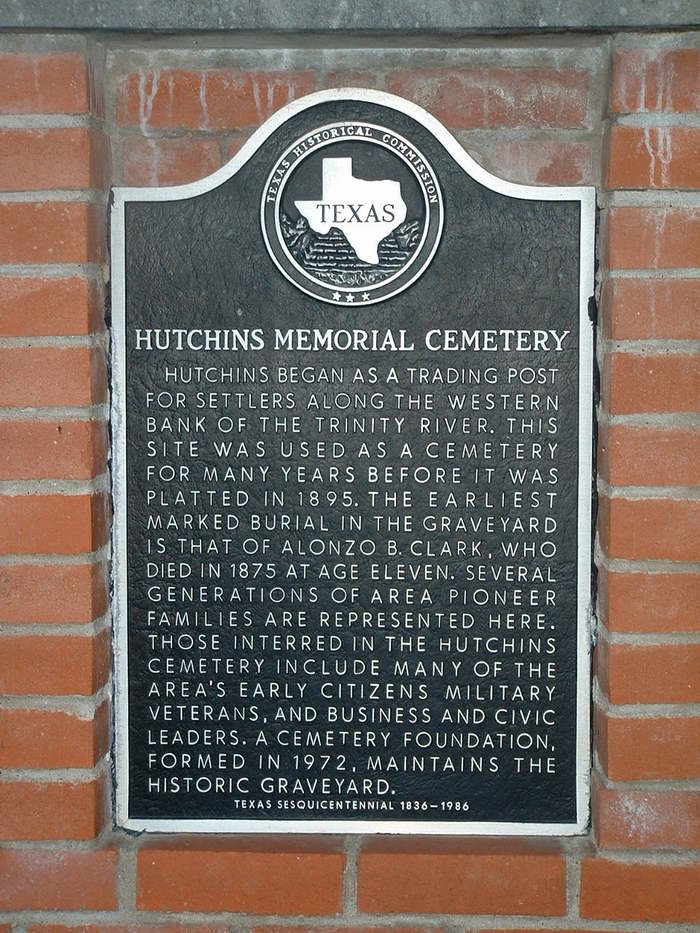 Hutchins began as a trading post for settlers along the western bank of the Trinity River. This site was used as a cemetery for many years before it was platted in 1895. The earliest marked burial in the graveyard is that of Alonzo B. Clark, who died in 1875 at age eleven. Several generations of area pioneer families are represented here. Those interred in the Hutchins Cemetery include many of the area's early citizens, military veterans, and business and civic leaders. A cemetery foundation, formed in 1972, maintains the historic graveyard.