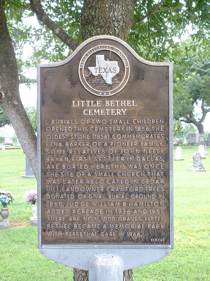 Burials of two small children opened this cemetery in 1856. The oldest stone (1858) commemorates Etna Barker, of a pioneer family. Some relatives of John Neely Bryan, first settler in Dallas, are buried here. This was once the site of a small church that was later relocated in Cedar Hill. Landowner Crawford Trees donated original burial ground in 1860. Judge William B. Hamilton added acreage in 1936 and 1951. There are now 1,000 graves. Little Bethel became a memorial park with perpetual care in 1966.