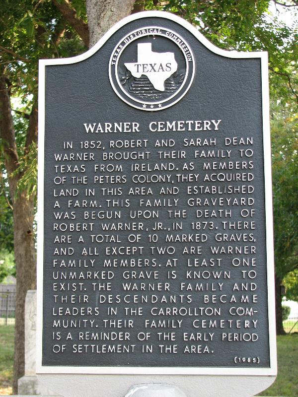 In 1852, Robert and Sarah Dean Warner brought their family to Texas from Ireland. As members of the Peters Colony, they acquired land in this area and established a farm. This family graveyard was begun upon the death of Robert Warner, Jr., in 1873. There are a total of 10 marked graves, and all except two are Warner family members. At least one unmarked grave is known to exist. The Warner family and their descendants became leaders in the Carrollton community. Their family cemetery is a reminder of the early period of settlement in the area.