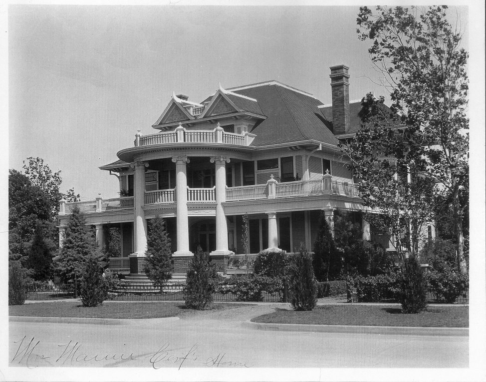 The old Cerf home was a replica of one from the 1900 World's Fair in Chicago. Mr. Isadore Cerf brought the plans back from the World's Fair and built the house for his first wife around 1902 and took over 2 years to complete. When his first wife died, Mr. Cerf married her sister, Mamie. The front entry of the home was on Ennis Avenue with doors that opened to a large foyer. At the opposite end was the staircase to the second floor. The property occupied half a city block and tall evergreen hedges formed a barrier from the alley at the back of the property. Climbing red rose bushes grew along the black wrought iron fences. Tall hedges framed the drive and turnaround driveway. Eventually the house was torn down, probably in the 1950s. The building site is presently occupied by the Ennis Public Library. Picture courtesy of DelMarie Murphy and Ennis Daily News. |