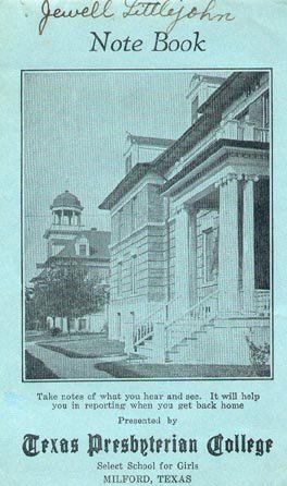 This is the cover of TPC notebook which was property of Jewell Littlejohn Guess, a resident of Milford, TX and student at TPC about 1928. Contributed by Joy Roberts of Ennis, TX |