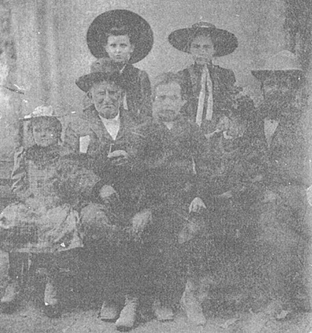 In the Photo from left to right standing: Nancy Pearson, Emma Pearson. Seated from left to right: Sarah Pearson, Joel A Dixon, Marvin Pearson, Bessie Pearson, & William Ward Wesley Pearson. About this time the Pearson's lived at Wyatt. Mr. Dixon was retired, and lived on his farm about 4 miles northeast of the business area of Waxahachie. W.W.W. Pearson was nephew to Joel A Dixon. His mother Mrs. Sarah Dixon Pearson also is written up in the Ellis County History published 1892, on page 681. This photo was copied from an old Tin Type, that has become very dark. I have cleaned it up on the computer, and done about as much with it as I can. Taken at Waxahachie in 1892. |