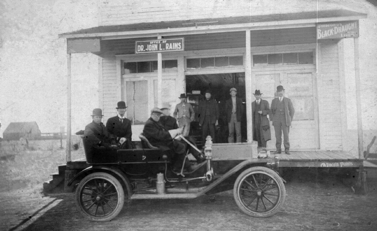 From my grandmother's photo collection: Dr Rains had is office in Rankin and later Bardwell. This photo was made between 1900 and 1910 in front of his office in Rankin. He is supposed to have had the first automobile in the community and one of the first in Ellis County. If we could identify the make and model, we might be able to pinpoint the year. My mother was delivered by Dr. Rains in 1915. I was born in 1934 across the road and about 100 yards west of where this photo was made. For the past 21 years I have been the official corresponding secretary and co-chairman of the Rankin Reunion Committee and un-official historian of the community. I am in the process of writing a new History of Rankin, Ellis County, Texas. By combining many of the research tools and data bases available through the internet with first hand acquaintance with all of the historical Rankin families, and my own experience of being born and raised there, I hope to correct many of the myths and errors surrounding the history of Rankin and Austonia that have been written by 3rd party folks from heresy information. This is being provided to the Ellis County Historical Society in support of a State of Texas Historical Marker we plan to have errected in the community.