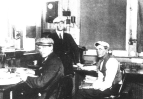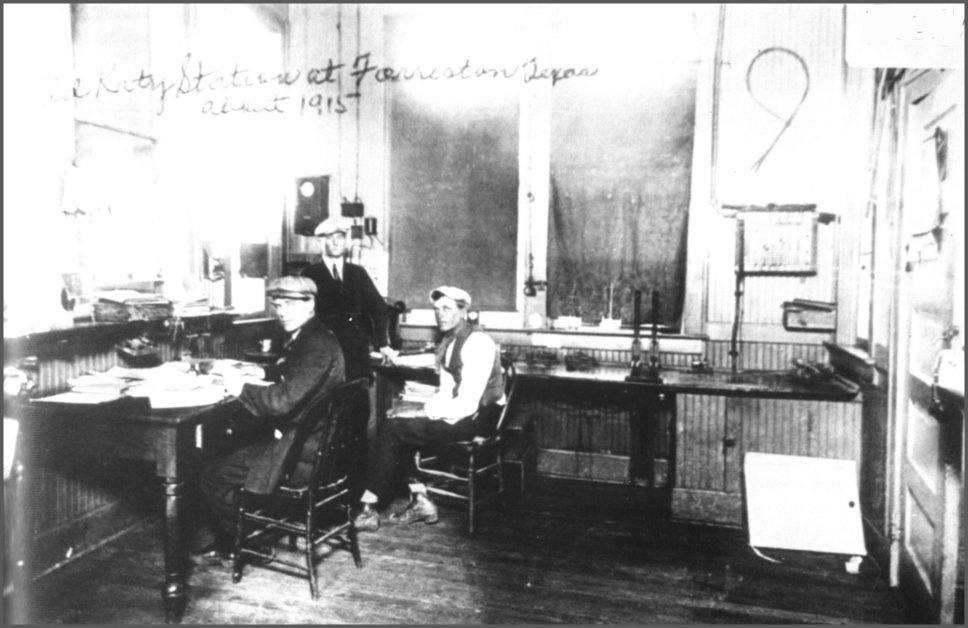 Katy (MK&T) Railroad Station at Forreston, ca 1915 L-R: Mr. Lowe, agent; Clarence Bohanan, assistant agent; Bill Worley, Visitor. (Courtesy Ellis County Museum) |