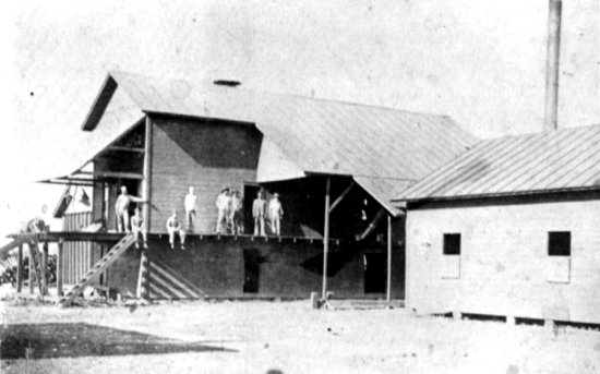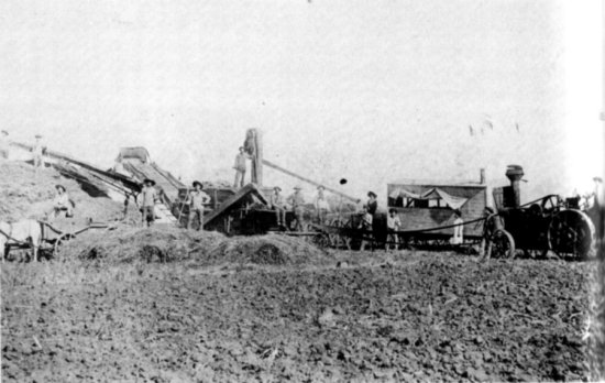 Threshing time in Forreston, Texas, 1920's. This steam thresher had a boiler that was fired with coal. Thresher shown far right with John L. Taylor of Forreston at controls. The long belt pulled the grain separator to extract the grain. The mule-drawn wagon hauled the straw to the separator. The straw, front left is waiting to be separated. The big stack, left background, has already been separated. The long spout on the left conveys the grain after separation, while the chute on the left conveys the straw to the stack. Left of the thresher is the cook shack. |