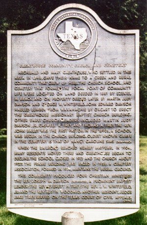 Greathouse Community Church and Cemetery Archibald and Mary Greathouse, who settled in this area in 1848, gave their name to a creek and rural community that grew up here. The church, school, and cemetery that formed the focal point of community life were located on land deeded in 1881 by Ezekiel M. Brack, and on property deeded later by Martin Judy Dawson and George W. Whitefirld. John Edward Dawson hauled lumber from Waxahachie by oxcart to erect the Greathouse Missionary Baptist Church Building. Other early church leaders included Martin Judt Dawson, Jr., Caswell R. Tirey, and Thomas A. Trey. The Rev. John Bailey was the first pastor in the 1890s. A. school was begun in the church building. Oldest known grave in the cemetery is that of Nancy Caroline Sims (___-___). When the railroad reached nearby Maypearl in 1904, many residents moved there and Greathouse began to decline. The school closed in 1912 and the church about 1922. The frame building was razed in 1958. A cemetery association, formed in 1974, maintains the burial ground. This community produced four Christian ministers: the Rev. Joseph M. Dawson (___-___), a prominent Baptist leader; the Rev. Everett H. Tirey; the Rev. J. W. Whitefield, Jr.; and the Rev. Austin Woodard. Another resident, Judge Jake Tirey, served on the Texas Court of Civil Appeals. (____) |