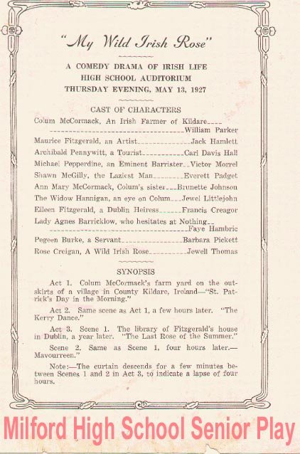 Milford High School Senior Play Program, 1927 Cast: William Parker, Jack Hamlett, Carl Davis Hall, Victor Morrell, Everett Padget, Brunette Johnson, Jewell Littlejohn, Francis Creagor, Faye Hambric, Barbara Pickett and Jewell Thomas. [Cast members included to facilitate searching.] Contributed by Joy Roberts of Ennis, TX |