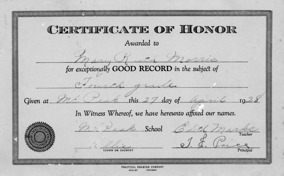 | Certificate awarded to my aunt, Ruth Morris, in 1928, signed by her teacher Edith Marks and principal T. E. Price. |