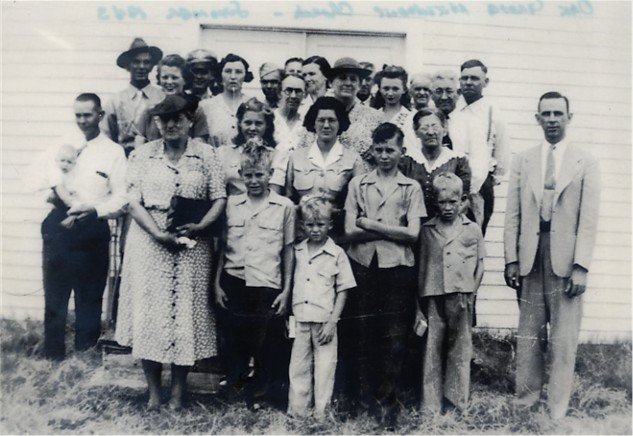 Oak Grove Methodist Church This picture was taken in the summer of 1943. The only ones I can identify for sure are my own family: At far left is my dad, J D Gray holding his daughter Sallie Nan Gray. In the front row the children are from left to right: Robert Gray, Jerry Gray, Charles T Gray and myself, J D Gray, Jr. In the center near the rear, the lady looking to her right is my mother Sarah Ione Keener Gray. Behind her (with just eyes showing) is my oldest brother William Carl Gray. In front of my mother is Mrs Emmert. I remember Mrs Emmert as she cared for me when I was an infant with diphtheria. |