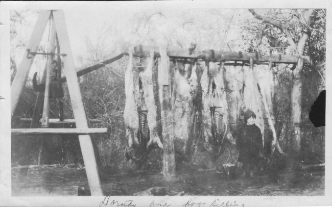The girl in this photo is my mother, Dorothy Reese, probably taken about 1925, on the farm of her parents, Sam and Norma (Belew) Reese. While probably every farm family in Ellis County slaughtered hogs, I am not sure how many of them thought posing a child in front of the dead animals was photogenic. <g>
