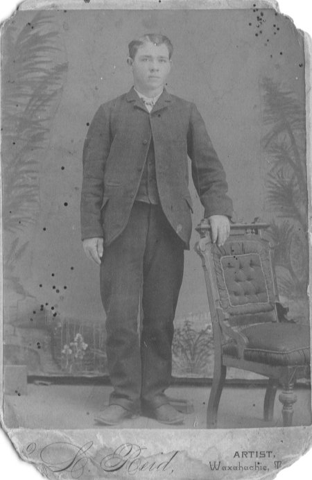 Marvin Bishop TURNER as a young man. He was the youngest child of Walter M. and Almarinda (BRADSHAW) TURNER, born 12 Sep 1871 in Boz, Ellis County, TX, died 27 May 1950 and buried in Oakwood Cemetery in Jacksboro, Jack County, TX. Married Dora L. HOWELL 29 Nov 1894 in Boz, Ellis County, TX. They had 11 children including Lee TURNER (born 1896 Ellis County) and Harry Key TURNER (born 1912 Jack County) who were lifetime residents of Waxahachie. Picture was taken ca 1890.