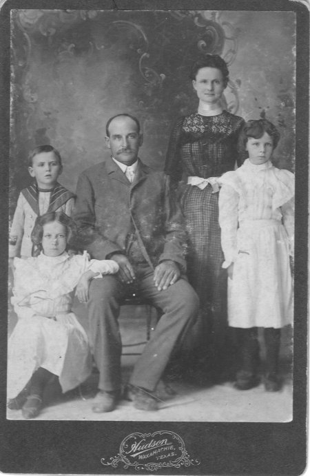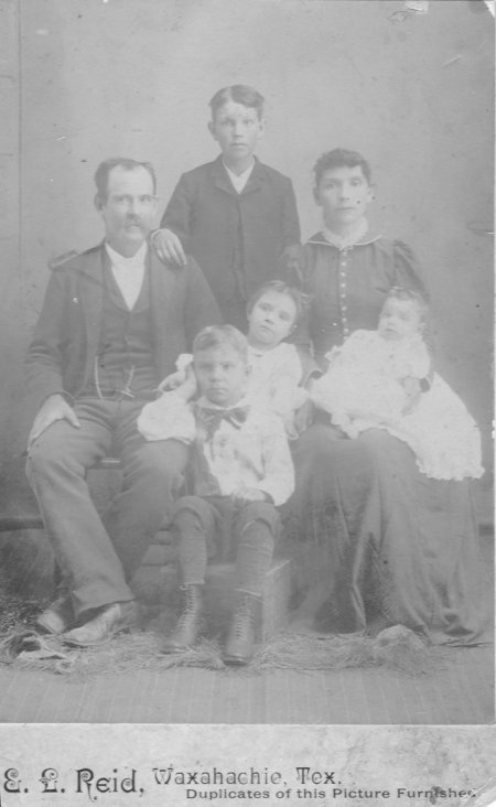 Walter M. TURNER, Jr. and his wife, Texanna (STEWART) TURNER and three of their seven children. He was born 20 Dec 1861, the eighth child of Walter M. TURNER and Almarinda BRADSHAW TURNER of Ellis Co., TX. His wife was born in Buenavista, TX. They were married 30 Jan 1887 in Waxahachie. He is buried in Bethel Cemetery, Ellis Co.,TX. Picture taken early 1900's.