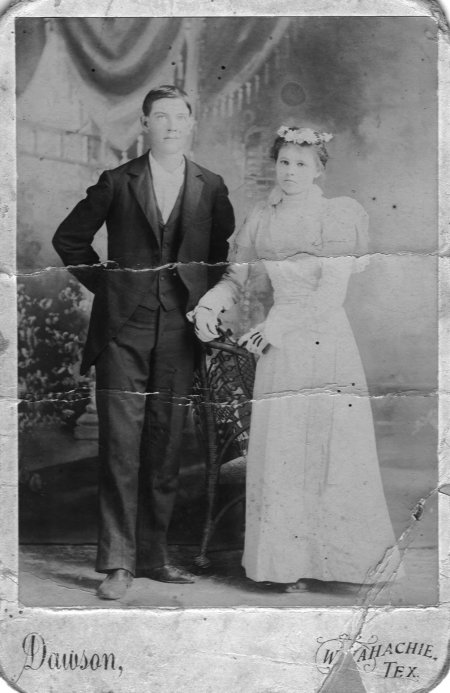 Ernest William TURNER (born 1879) and Caldonia Irene (INGLE) TURNER. "Willie" was the son of Romeo TURNER and Emma (GILMORE) Turner, and the grandson of Walter & Almarinda TURNER of Ellis Co., TX. Picture taken ca 1900.