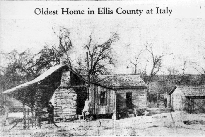 OLDEST HOME IN ELLIS COUNTY AT ITALY. "The above picture represents an old ranch home near Italy, Texas, and is the oldest house standing in Ellis County. It is the old ADDISON WARDLAW ranch house located about seven miles west of Italy, where it has stood for almost one hundred years. Built of logs hewn from native trees which grew along Bee Creek and covered with clapboards with a chimney built of rocks selected from the hills about the place, the old house with few additions such as side rooms stands today as one of the relics of frontier days. Though the builder died many years ago, his children, now on the evening side of life, live in distant parts of the state. The youngest son, Joe Wardlaw, who was born in the old home, is an honored citizen of Italy." (source: unknown newspaper). "Addison Wardlaw had a farm located in the hills on the Milford road three miles south of the Bee Creek school. This farm house was said to have been a stagecoach stop or way station. At one time the mail was brought from Milford to the Wardlaw farm where it was picked up for distribution. Lucy Ann Witten, wife of Patrick Shields Witten, rode a horse to the Station, collected the mail, and carried it to their farm at Bee Creek for further distribution." (ref: Bee Creek, a Ghost Town in Ellis County) |