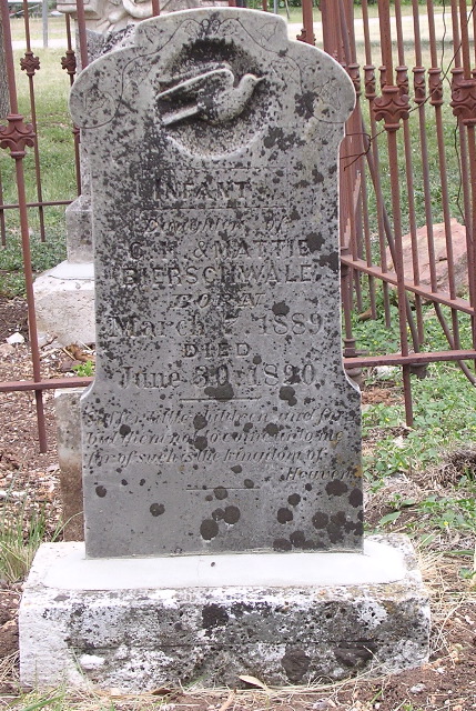 | Bierschwale, Infant daughter of C. B. and Mattie | b. Mar. 7, 1889 | d. June 30, 1890 | Row I | Photo |