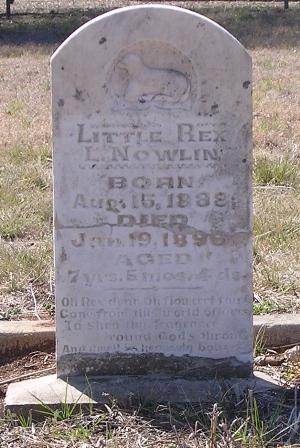 | Nowlin, Rex L. (child) | b. Aug. 15, 1888 | d. Jan. 19, 1896 | Row H | Photo |