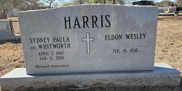 | Harris, Sydney Paula (Polly) nee Whitworth | 7 Apr 1947 | 11 Jan 2019 | NII | 168 | 003 | Tombstone |