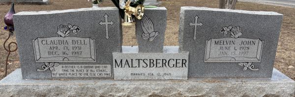 | Maltsberger, Claudia Dell nee Anthony | 13 Apr 1931 | 16 Dec 1987 | NI | 108 | 003 | Tombstone |