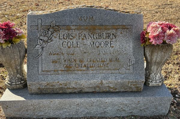 | Moore, Lois Mae nee Pangburn (1st husband: Jack Cole) | 1 Aug 1915 | 14 Jan 1995 | NIII | 401 | 005 | Tombstone |