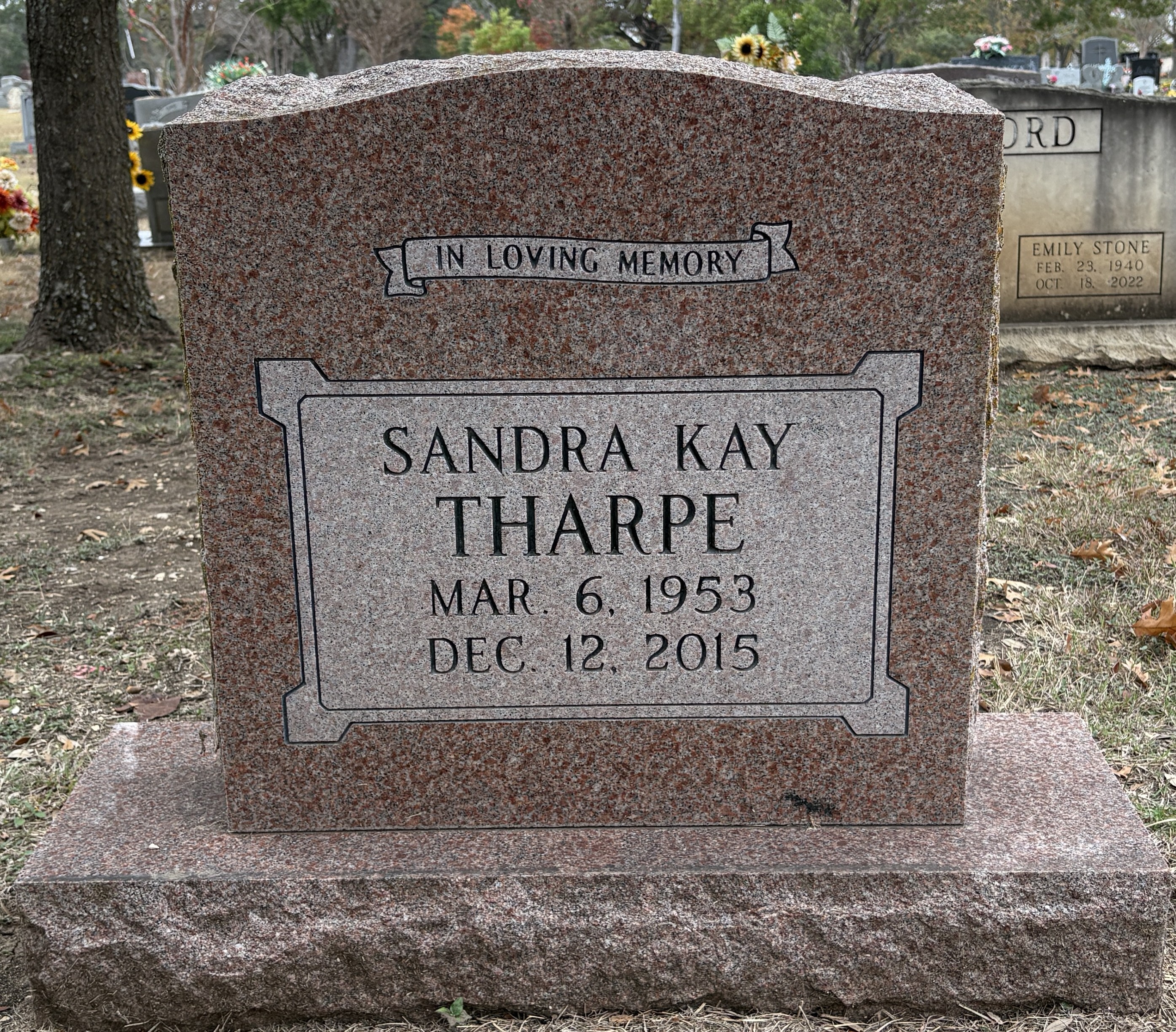 | Tharpe, Sandra Kay nee McCord | 6 Mar 1953 | 12 Dec 2015 | NI | 5A | 003 | Tombstone |