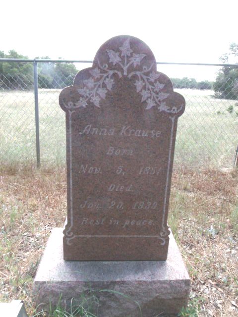 | Krause, Adolph | 1883 | 1883 | Tombstone | Krause, Anna nee Seidemann (Mrs. John Krause) | b. 5 Nov 1851 | d. 20 Jan 1939 | Tombstone |