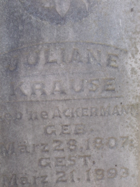| Krause, Julianne | b. 28 Mar 1807 | d. 21 Mar 1893 | Tombstone | Picture |