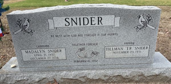 | Snider, Madalyn nee Guess | 21 Apr 1933 | 27 Dec 2016 | NI | 134 | 005 | Tombstone |