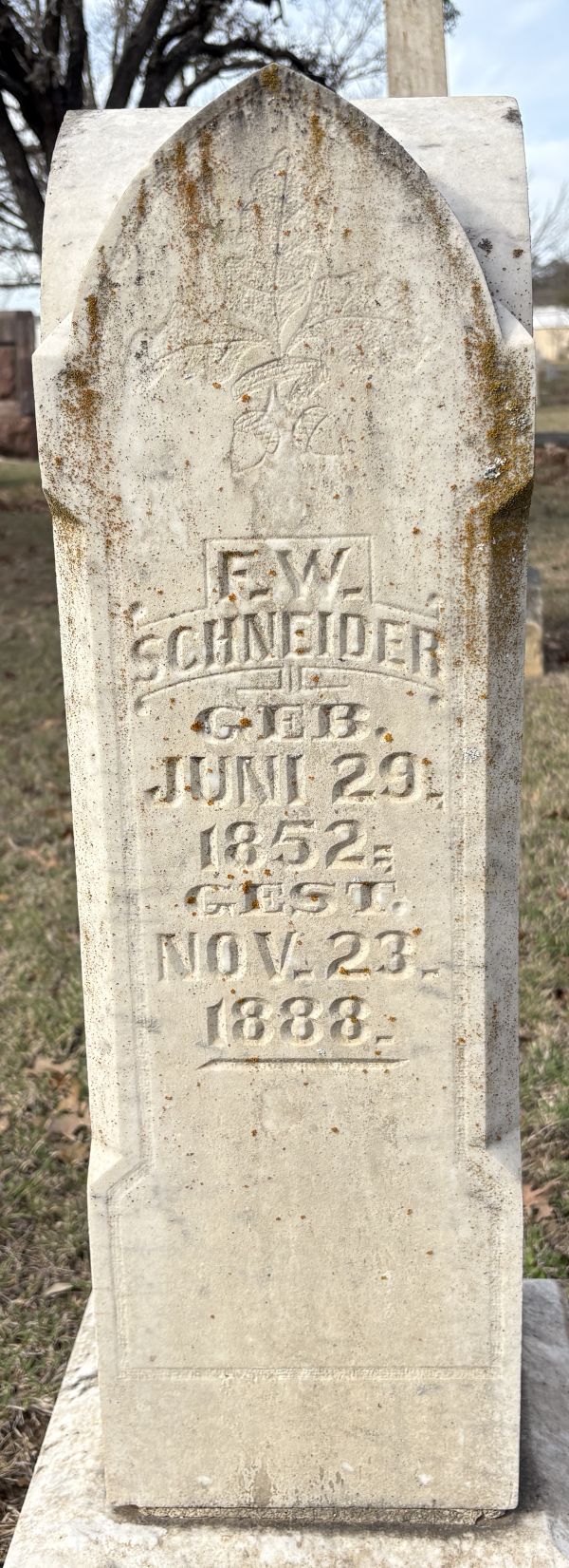 | Schneider, F. William | 29 Jun 1852 | 23 Nov 1888 | NEI | - | 128 | Tombstone |